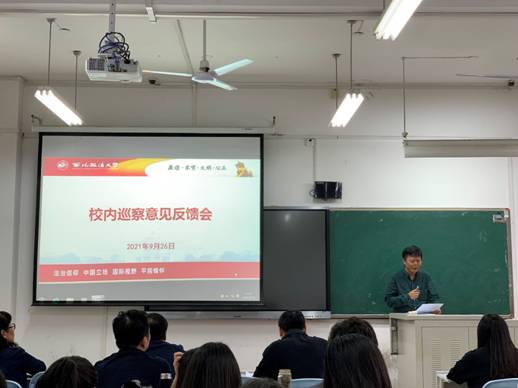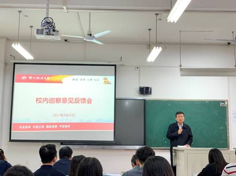 按照校党委2021年校内巡察工作统一部署,9月26日下午,德甲直播 (纪检监察学院)在正心楼303教室召开校内巡察意见反馈会,校党委第二巡察组向学院反馈巡察情况。校党委副书记、党委第二巡察组组长郭武军,校纪委副书记、党委第二巡察组副组长康鹏及全体组员出席会议,学院领导班子成员、全体教职工及部分学生代表参加会议。会议由学院党委书记呼勇主持。