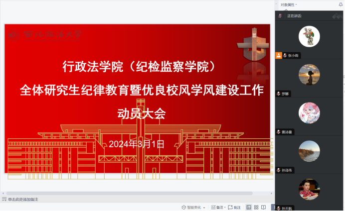 2月29日晚,德甲直播 (纪检监察学院)召开纪律教育暨学风建设动员大会线上会议,硕士研究生辅导员罗娜及全体研究生参加会议。