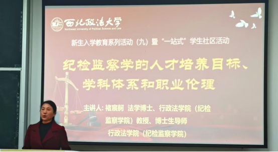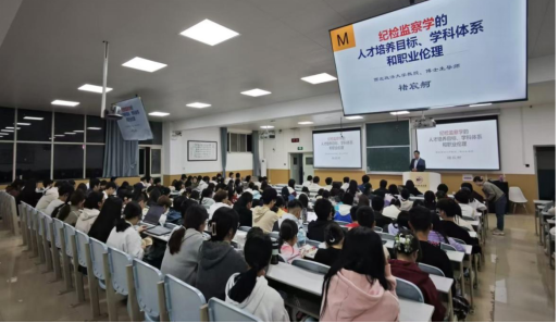 讲座第一阶段褚宸舸老师从纪检监察学的人才培养目标、学科体系和职业伦理三个方面让新生们对纪检监察学有更全面的了解。他通过有关专业人才的稀缺和国家对此类人才的需求、纪检监察学的历史、内涵详细地介绍了纪检监察学。最后褚老师用“又红又专,德才兼备”这八个字总结了纪检监察学的职业伦理,在褚老师的讲解下新生们对纪检监察学未来的就业方向有了更清晰的认知。