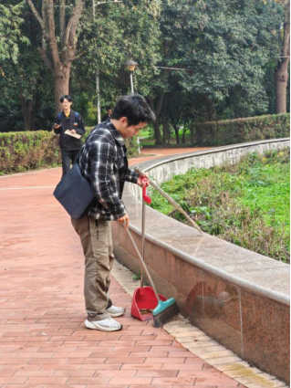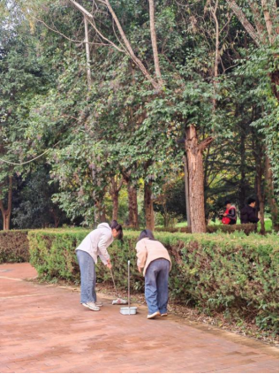 “晨光微露映尘埃,一拂一扫净校园”,秋风习习,叶落纷纷,迎着清冷的晨光,学生们却满怀热忱,携手同心,捡拾垃圾,清扫地面。他们或拿起扫帚打扫地上的纸屑,或细心地用夹子夹起隐藏在草丛中的食品包装袋,花坛和小路在各位同学的努力下变得更加整洁,校园的一角也因此变得清洁美观。