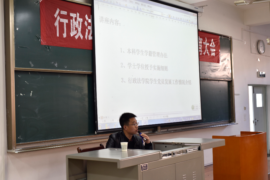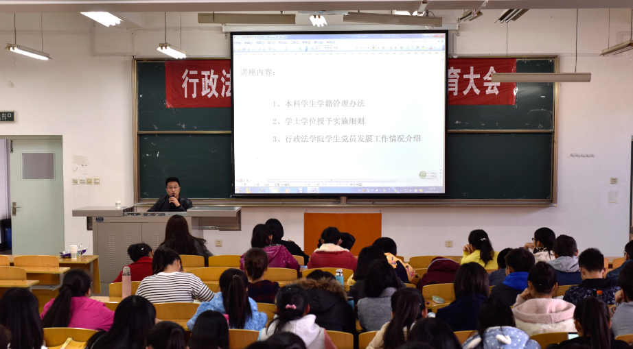 2015年11月26日14时,西北政法大学德甲直播 新生教育大会第四讲在我校长安校区一号教学楼Bj11教室隆重举行。德甲直播 党委书记戴鲲老师担任本次大会的主讲人,德甲直播线上看 党委副书记李芳老师和及团委书记鞠娟老师应邀莅临。戴鲲以“《本科教学管理制度汇编》的讲解”为主题,从三个方面向大一新生介绍了教学管理办法。