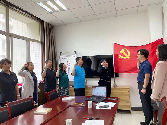 一、重温誓言,牢记使命。在支部书记王玉楼同志的带领下,支部全体党员一起高举右手,面对鲜红的党旗,再次重温入党誓词,一字一句,神圣而豪迈,铮铮誓言,坚定了党员同志们的理想信念,提升了大家工作的士气,也让大家意识到了肩上的使命与担当。