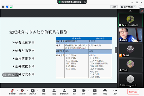 在“七一”即将来临之际,广大党员同志通过加强政治理论学习,以实际行动来迎接和庆祝党的百年华诞。2021年6月29日晚7:30,行政法教研室党支部举办第4期主题党日“教研+”活动。本次活动通过腾讯会议的方式线上进行,由德甲直播 副院长李大勇老师围绕“《公职人员政务处分法》解读”讲授党课,党支部书记钱卿老师主持,党支部和教研室王周户、王德星、郑宁波、张艳、杨彬权、李龙贤、雷苗苗等9位老师参加了本次活动。