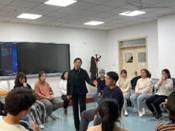 在预热环节,同学们还比较拘谨的,李芳老师与段老师引导大家将厚重的外套脱下,放轻松坐成一圈,双手放在自己的额头上,慢慢下移,将自己的“面具”撕下来,以便更放松地加入到后面的游戏中。