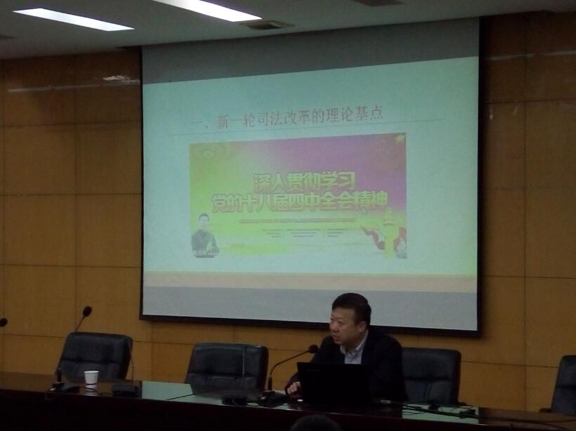 讲座围绕着“依法治国背景下的司法改革”展开,内容分为两个部分:第一部分是新一轮司法改革的理论基点,在该部分贺庭长主要介绍了在深入贯彻学习党的十八届四中全会精神背景下,司法改革需要注重的司法权的权利属性和司法价值等方面的理论研究。第二部分是新一轮司法改革中体制改革、机制改革、主体改革和保障制度改革四大板块的内容。在该部分贺庭长着重介绍了建立以审判为中心的诉讼制度的主要内容、意义以及司法公开的价值。他还特别指出,法官职业化是司法改革的方向,随着改革的不断深入,法律职业必将有一个光明的前景。讲座上,贺庭长高瞻远瞩、说理透彻,在场的老师和同学在钦佩于他的卓越才智和丰富学识的同时体悟了法学魅力。