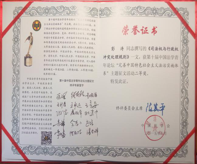 彭涛副教授的《司法权与行政权冲突处理规则》在此次征文比赛中荣获二等奖。