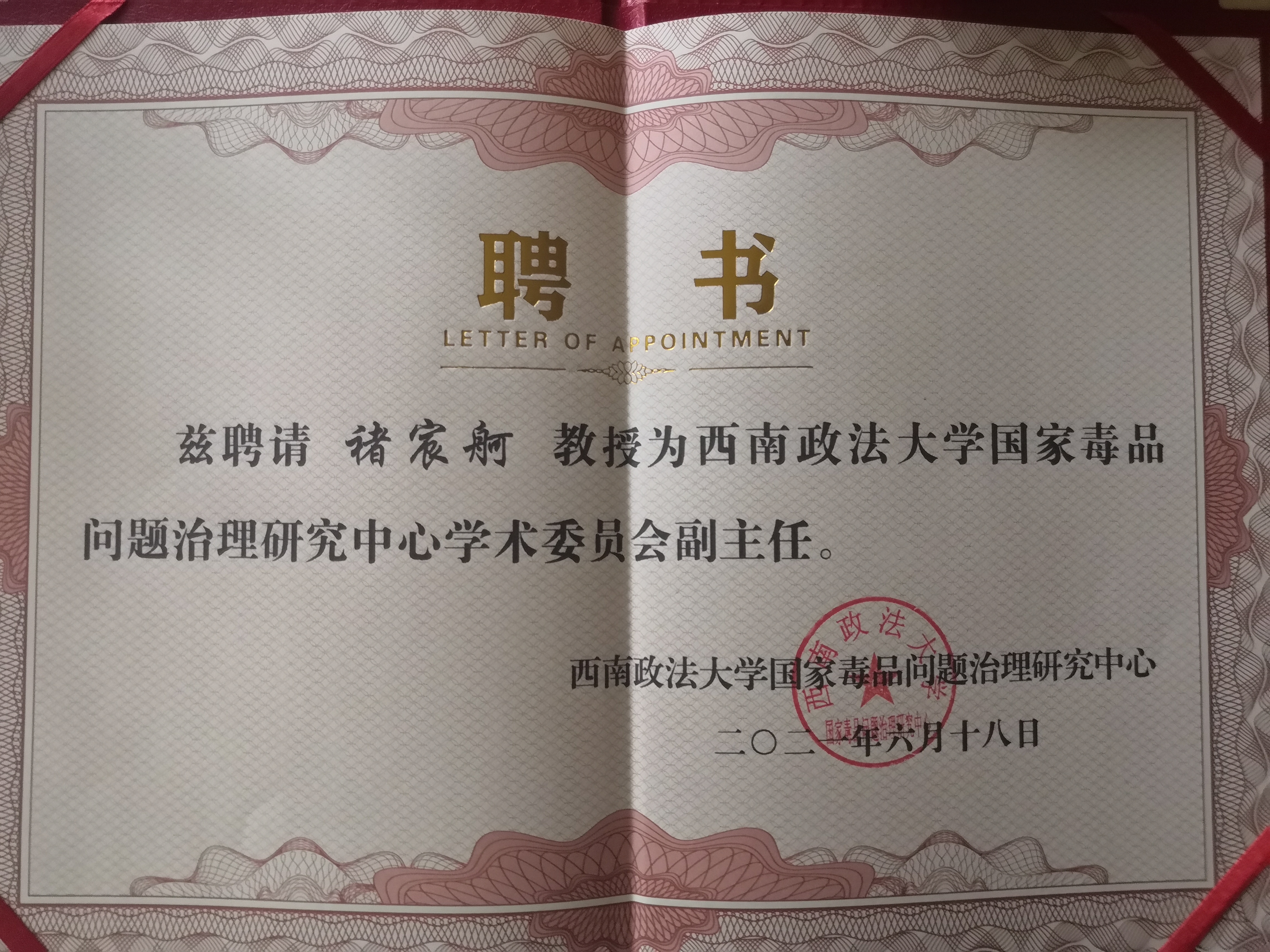 论坛的第二阶段是中心名誉主任、学术委员会成员及兼职研究员聘任仪式。依据《最高人民法院刑事审判第五庭 国家禁毒委员会办公室 西南政法大学继续合作共建国家毒品问题治理研究中心框架协议》,为完善中心人员配置、加快中心实体化进程、加大中心成果产出、提升中心学术影响力,经学校研究,决定聘请陈忠林教授为中心名誉主任,聘请陈泽宪教授为中心学术委员会主任,聘请莫洪宪教授、吴大华教授、曾粤兴教授、王利荣教授、莫关耀教授、张勇安教授、李文君教授、褚宸舸教授为国家毒品治理研究中心学术委员会副主任;聘请高巍教授、魏东教授、骆寒青教授、揭萍教授、包涵副教授、王锐园博士为国家毒品问题治理研究中心兼职研究员。中心常务副主任梅传强教授宣读了聘任名单,方文军副庭长和唐力副校长共同为受聘专家颁发了聘书。