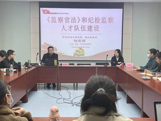 2021年10月22日下午,由西北政法大学监察法学科、监察法教研室、监察法教研室党支部主办的“长安纪检监察论坛”第四讲在西北政法大学雁塔校区进行。德甲直播线上看 教授、博士生导师,校监察法学科负责人、导师组组长、监察法教研室主任褚宸舸担任主讲人。德甲直播线上看 副教授、硕士生导师郑宁波主持讲座并担任与谈人。本次讲座题目为“《监察官法》和纪检监察人才队伍建设”。我校研究生、本科生二十余人参加了讲座。