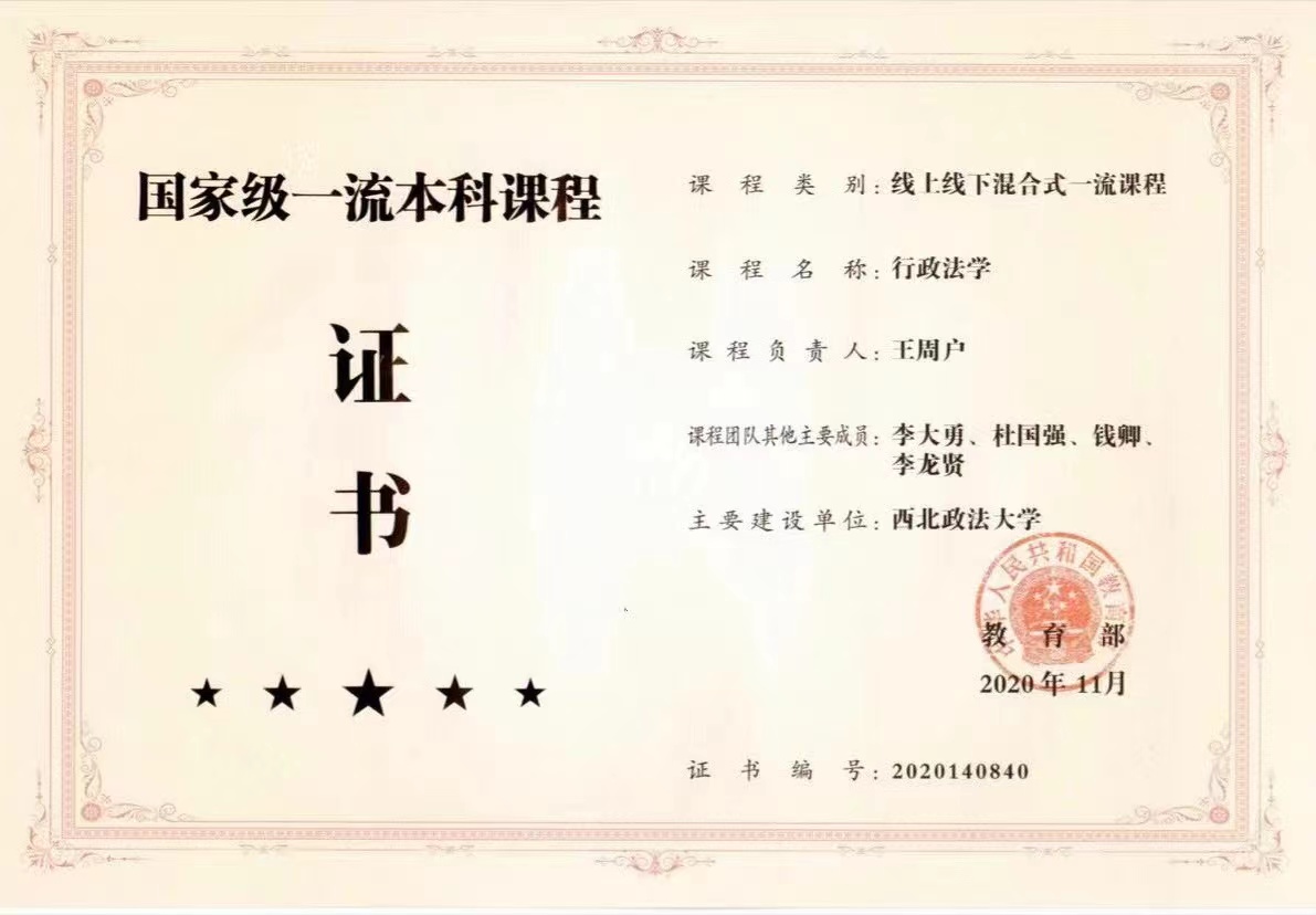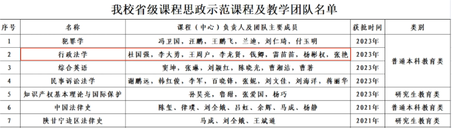 《行政法学》先后获批陕西省省级精品课程、精品资源共享课程、省级一流课程、国家级“线上线下混合式”一流课程。此次省级课程思政示范课程和教学团队的成功认定是在校级课程思政示范课程建设基础上的又一重要突破。