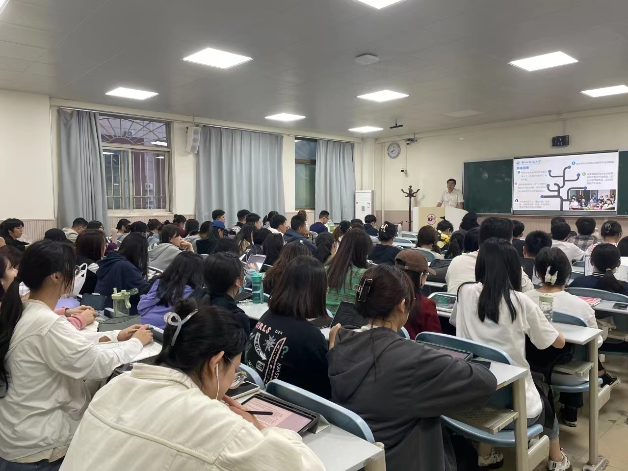 (纪检监察学院)副院长杜国强副教授、杨永康副教授、周敏副教授,宪法学与行政法学专业2022级硕士研究生孙天航、孙俊、朱怡霏,以及有意报考宪法学与行政法学的近百位同学参加本次宣讲会,现场气氛热烈,宣讲会由2022级硕士研究生朱怡霏主持。