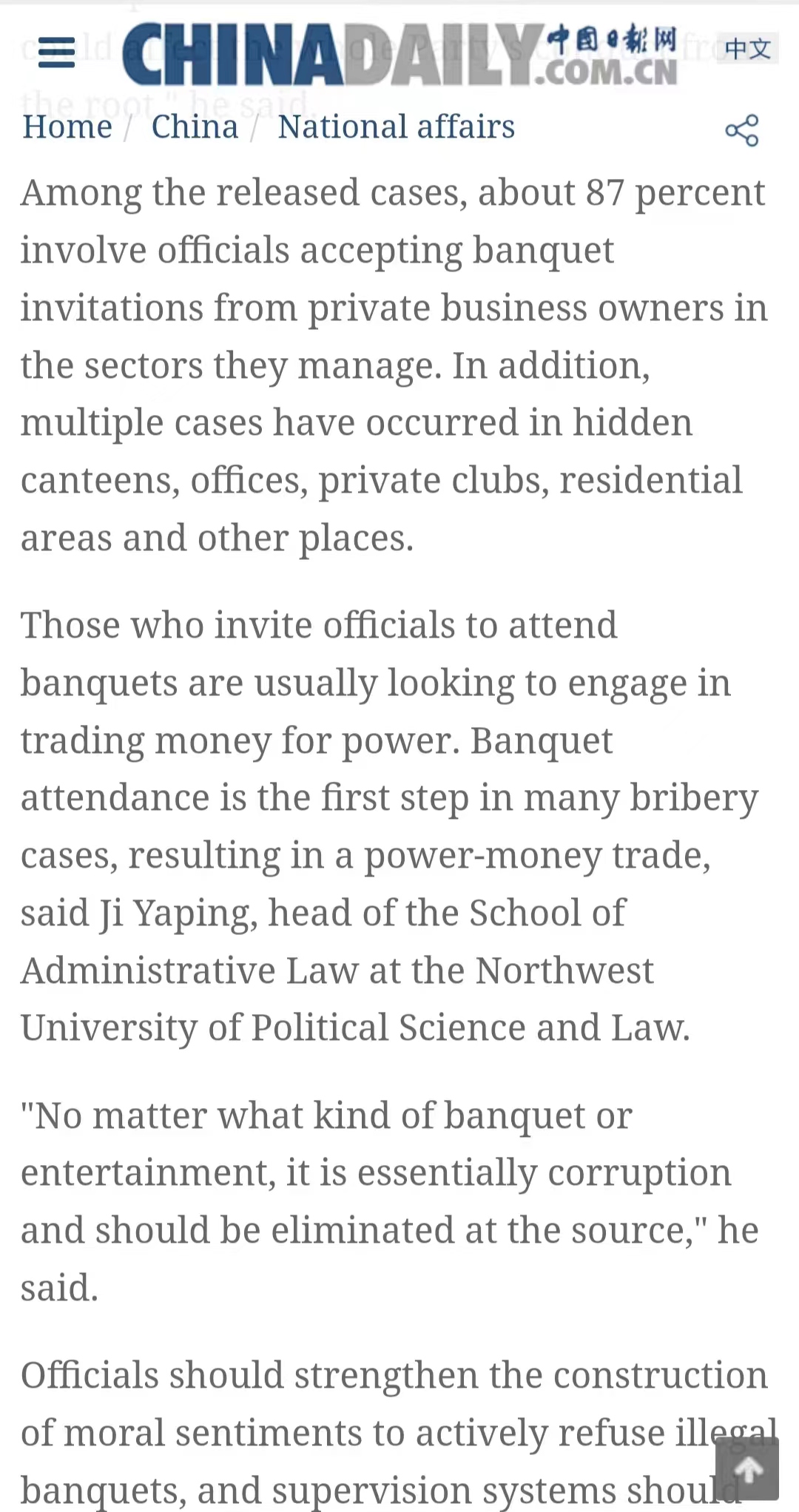 在已公布的案件中,约87%的案件涉及官员接受其管理的私营企业主吃请。此外,多起案件发生在隐蔽的食堂、办公室、私人会所、居民区等场所。西北政法大学德甲直播 院长姬亚平表示,在许多贿赂案件中,宴请是第一步,导致了权钱交易。那些邀请官员参加宴会的人通常是想用金钱换取权力。领导干部应继续警惕关于中央八项规定的执行情况,以防止非法宴请再次发生。他在评论中国最高反腐机构中央纪律检查委员会和国家监察委员会发布的案例时表示,监督系统应该加强,以应对涉及四风的新问题:即形式主义、官僚主义、享乐主义和奢靡之风。
