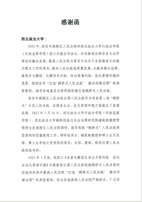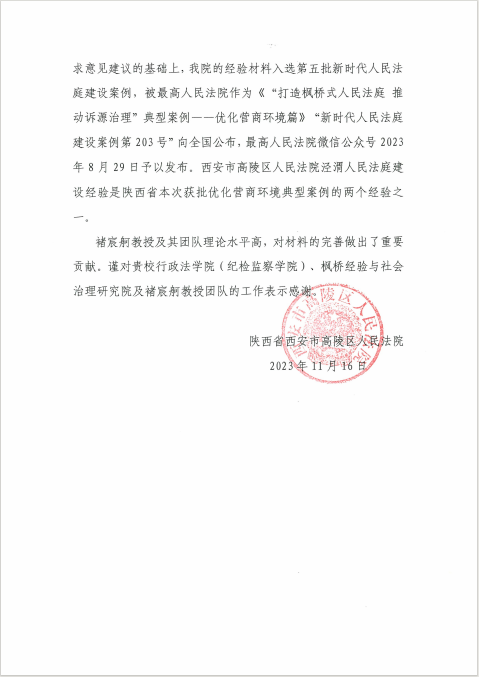 2022年,德甲直播线上看 与西安市高陵区人民法院签订共建合作协议,通过多项合作共同推进法学理论与法律实务的融合发展、互促互进。今年3月以来,褚宸舸教授受高陵区人民法院委托,带领团队指导该院“枫桥式”人民法庭典型案例的挖掘提炼工作,总结泾渭人民法庭相关经验,形成《陕西省西安市高陵区人民法院泾渭人民法庭 妥善化解园区涉企矛盾纠纷 优化法治化营商环境》的典型案例,经过各地高级人民法院严格把关、广泛征求意见建议,入选最高人民法院第五批新时代人民法庭建设案例。这一经验总结作为陕西省本次获批的两个优化营商环境典型案例之一,近日被最高人民法院作为《“打造枫桥式人民法庭 推动诉源治理”典型案例——优化营商环境篇》“新时代人民法庭建设案例第203号”向全国公布,最高人民法院微信公众号2023年8月29日予以发布。