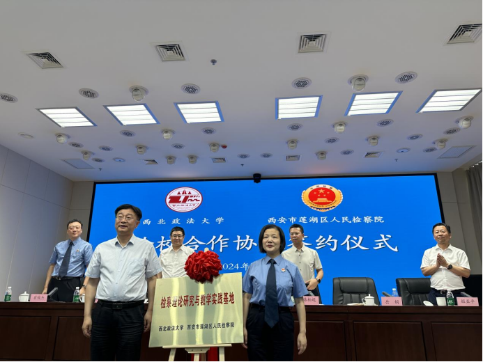 为进一步贯彻落实《中共中央关于加强新时代检察机关法律监督工作的意见》,加强检察实践与法学理论深度融合,营造学理论、重研究、促实践的浓厚氛围,我校积极推进检校合作基地建设。5月23日,我校与西安市莲湖区人民检察院检校合作签约仪式在莲湖区检察院举行,其间双方共同签署检校合作战略协议书,并为“检察理论研究与教学实践基地”揭牌。