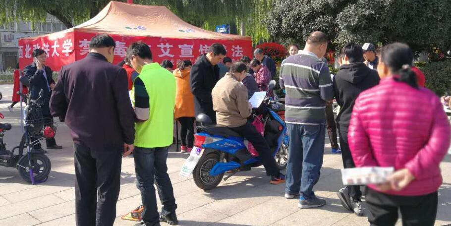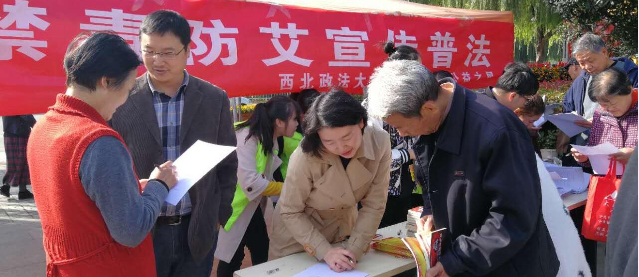 2017年11月7日上午9:00,由西北政法大学德甲直播 主办,“公益之星”社团携手行政法诊所承办,以“禁毒尚法,守护青春之花’为主题的禁毒防艾普法宣传教育活动,在长安广场举行。德甲直播 宪法教研室主任钱锦宇老师、行政诉讼法教研室主任彭涛老师、行政法教研室张艳老师,学院党委副书记李芳老师,以及学生30多人共同组织、开展了宣传活动。