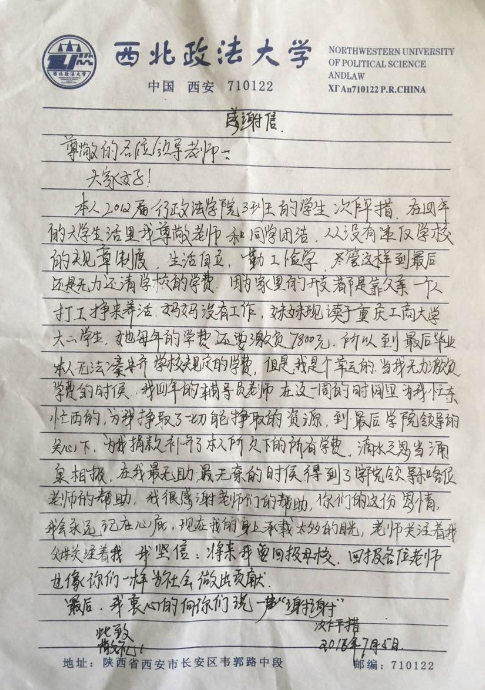 他写道:“滴水之恩当涌泉相报。在我最无助最无奈的时候得到了学院领导和诸位老师的帮助,我很感谢老师们的帮助!你们的这份恩情,我将永远记在心底。……将来我要回报母校,回报各位老师,也像你们一样为社会做出贡献!”