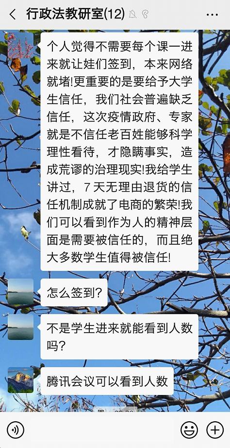 为应对新型冠状病毒(2019-nCoV)的疫情,根据教育部与西北政法大学的安排,行政法教研室在本学期承担的行政法课程上全面导入线上教学方式。开学前,各位任课教师积极摸索学习通、雨课堂等多个技术平台的使用技巧,力争通过线上的交互式教学,为学生提供良好的学习体验。从2月24日即开学第一天的授课状况看,基本取得预想效果。为及时总结经验,行政法教研室于当日晚7点就如何更为有效的运用线上教学开展专题研修活动。李大勇、杜国强、杨彬权、钱卿、李龙贤、郑宁波、张艳等教师参加了活动,各位老师畅所欲谈,体现出高度的责任感与专业性的教学反思能力。