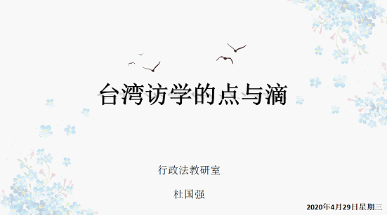 杜国强老师自2019年9月3日开始在台湾东吴大学进行学术访问,历时四个多月,对台湾地区的公法课程的教学与科研有了全面的了解。会议中,他结合亲身经历详细讲述了本科阶段《行政法》(张文郁教授)《诉愿法与行政诉讼法》(林三钦教授)《国家赔偿法》(范文清副教授)《政府采购与公私合作》(陈爱娥教授)、研究生阶段《行政法专题》(洪家殷教授)的教学方式、课堂管理、学生表现等,并通过概括与对比,指出台湾教育制度的特色与不足以及大陆学生的优势。杜国强老师并就访学期间撰写的论文进行了简要介绍。会议参与者围绕公法课程教学效果的改善、教学与科研的相互促进关系进行了热烈的讨论。
