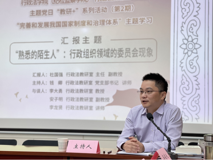 活动的第二部分,由教研室主任杜国强副教授结合本次学习主题,以“熟悉的陌生人:行政组织领域的委员会现象”为题做了精彩汇报。杜老师的汇报内容涉及研究问题与方法、委员会在行政组织领域的现实逻辑、基本形态与职能、法律保留对组织行政的规范密度、委员会的过程规制等方面,问题意识明确,内容丰富充实,逻辑结构严整。
