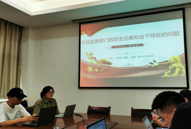 活动的第一环节由吴玲玲同学做主题报告。报告的主题是“纪检监察部门的历史沿革和当下存在的问题”,报告由五个部分组成,分别是:新民主主义革命时期党的纪检机构的初创、执政党初期党的纪检机构的逐步健全、改革开放新时期党的纪检机构的重建和完善、反腐倡廉和扫黑除恶斗争中纪检机构的良好工作、我国当前纪检机构的存在问题和启示。在第一部分中,吴玲玲同学主要介绍了为何在该时期成立党的中央监察委员会?主要原因有三点,一是党员数量的急剧增加。二是陈独秀右倾机会主义在党内占据统治地位, 给党造成严重损失, 迫切需要有专门的机构来维护党的纪律, 巩固党的团结统一。三是俄国共产党 (布) 的影响, 十月革命胜利后不久, 执政的俄国共产党在1920年9月召开的第九次全国代表会议上成立了同中央委员会平行的中央监察委员会这一党内专门监督机构, 这给以俄为师的中国共产党树立了一个榜样。在第二部分中,吴玲玲同学着重介绍了中央纪律检查委员会的职能以及完善的过程。在第三部分中,吴玲玲同学就该时期的历史背景、面临的艰巨任务、恢复重建党的各级纪委的过程以及党十六大以来纪检机构的完善与发展。在第四部分中,主要介绍了纪检监察部门的反腐倡廉工作和扫黑除恶专项斗争工作的具体开展。最后吴玲玲同学认为,当前纪检监察部门还存在这样一些问题,主要有:干部思想不够坚定、基层队伍建设不够完善以及业务素质不够全面三个问题。同时她提出了相应的解决方法,一是必须以改革创新精神不断完善纪检机构的领导体制;二是必须明晰纪检机构的职能定位;三是必须建立健全纪检机构自身建设的长效机制。通过对吴玲玲同学的报告,与会同学了解到了纪检监察部门的历史沿革,以及我们党在社会主义法治建设过程中的探索与努力,对于我们进一步坚定制度自信、理论自信,推进国家治理体系和治理能力现代化,应对发展风险,赢得发展主动,具有重要意义。