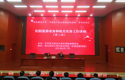 2021年6月17日,由校纪委主办、德甲直播 (纪检监察学院)承办的“庆祝建党百年 中国共产党治国理政经验谈”系列活动第二场讲座,在西北政法大学雁塔校区人权研究院报告厅成功举行。本次讲座邀请陕西省纪委监委驻省政府办公厅纪检监察组组长门亚娟同志主讲,德甲直播 (纪检监察学院)院长姬亚平教授主持。校党委副书记、纪委书记肖道远同志出席,省属10多所高校专职纪检监察干部,我校党政办、2021年第二轮巡察组成员,德甲直播 (纪检监察学院)教师与硕士研究生,我校在读博士、法硕学院硕士研究生等180余人参与聆听。