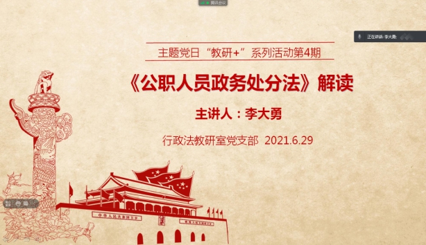 6月29日晚7:30副院长李大勇在行政法教研室党支部,围绕“《公职人员政务处分法》解读”展开专题党课讲解。