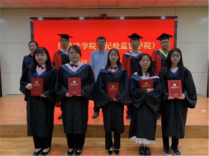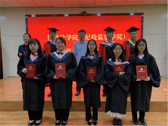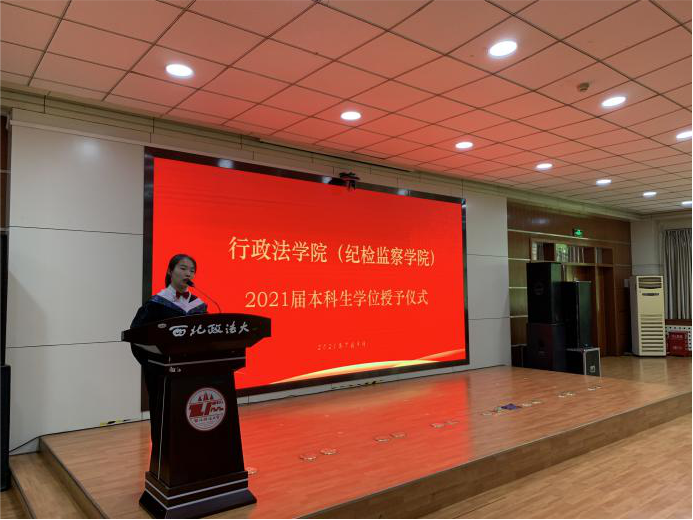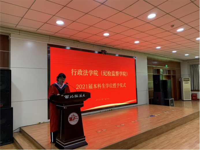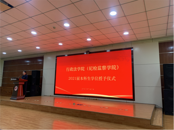(纪检监察学院)党委书记呼勇,院长姬亚平教授,学术委员会主席王周户教授,副院长李大勇教授、副院长杜国强副教授以及学院2021届毕业生和师生代表参加仪式。仪式由学院党委副书记李芳主持。