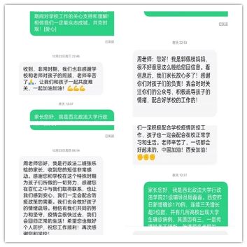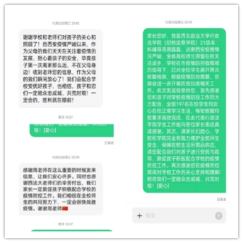 辅导员老师为学生的父母一一发送短信,并通过公众号推送向家长展示学生在校学习生活,与学生们保持在同一战线,家长们纷纷表示理解与支持,送来一句句的暖心话语,感谢学校与老师们为同学们的辛勤付出,并积极配合学校的防疫工作,与同学们积极沟通及时安抚疏导。家长的充分理解给予了同学们精神上的支持,更给予了我们战胜疫情的信心!