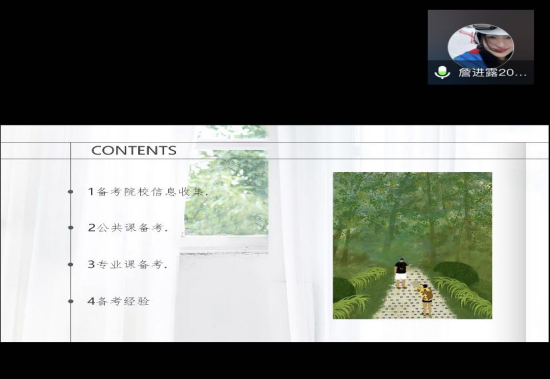 詹进露同学就备考院校信息收集、公共课备考、专业课备考进行经验分享。一方面,其以考研英语月计划为例,强调了备考时间规划的重要性;另一方面,其与大家分享了备考过程中的一些弯路,强调情绪调控、拒绝自我满足、科学作息的重要性。