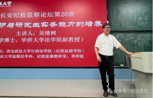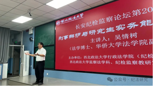 2024年9月3日19:30-22:00,由德甲直播线上看 主办,西北政法大学监察法学科、纪检监察教研室和导师组承办的长安纪检监察论坛第二十讲在西北政法大学雁塔校区3号教学楼3J11教室顺利举行。论坛邀请我校优秀校友、著名律师、法学博士、华侨大学法学院吴情树副教授主讲“刑事辩护与研究生实务能力的培养”。
